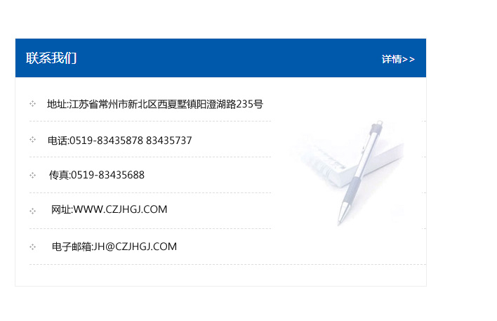 地址:常州市新北區(qū)友邦商務(wù)大廈1幢16、17層  電話:0519-85101652  傳真:0519-85112595  郵編:213022  網(wǎng)址:www_cz-jiayue_cn.jfczy.com  郵箱:xiajifengaa@163.com
